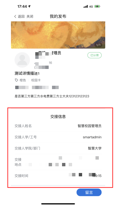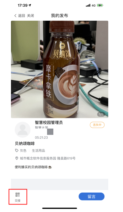 ②交接者可以手机端进入失物招领平台打开扫一扫,扫描二维码记录交接信息,填写完成后交接信息就会记录在帖子上,只有发布者和交接者可以看到交接信息。