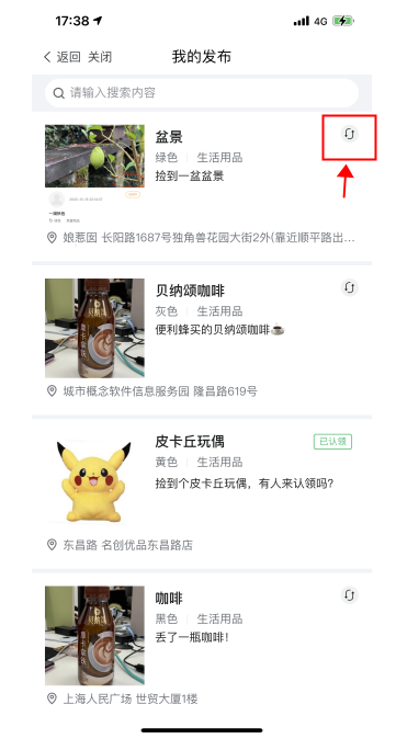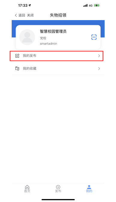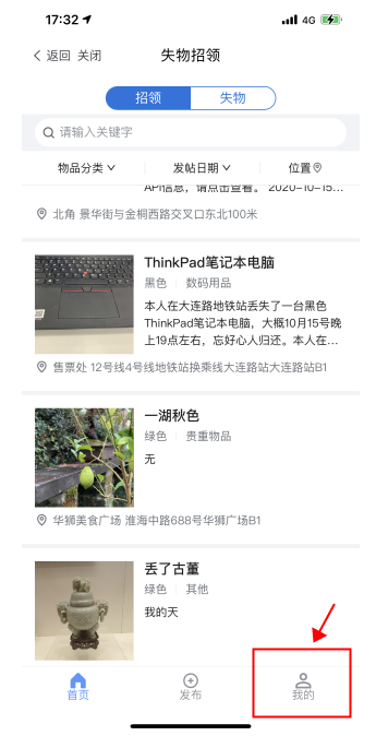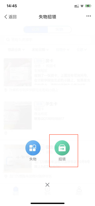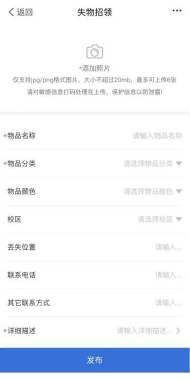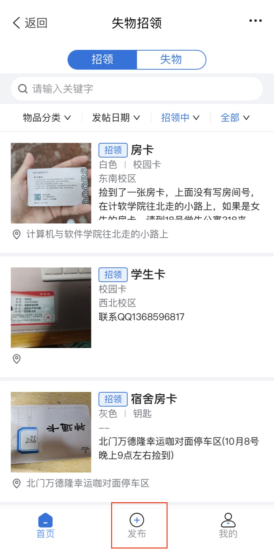 (1)如果拾到物品,可以点击【发布】选择【发布招领】,然后填写相关信息并发布。