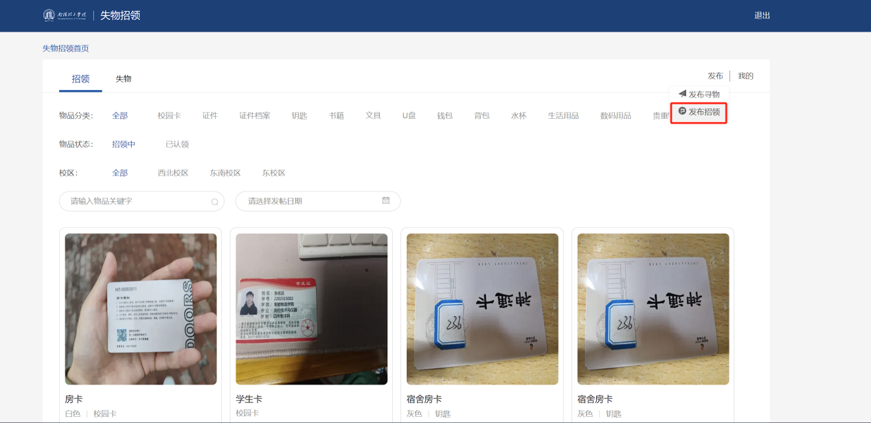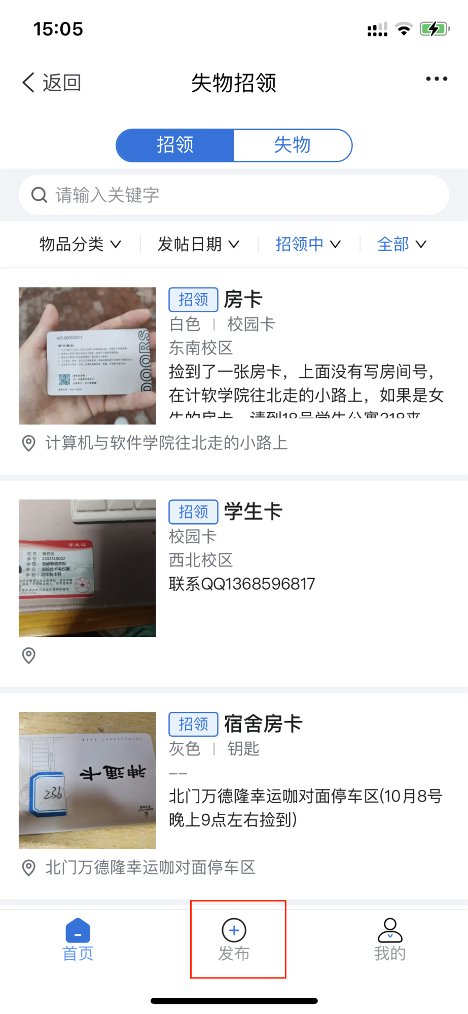 (1)如果拾到物品,可以点击【发布】选择【招领】,然后填写相关信息并发布。