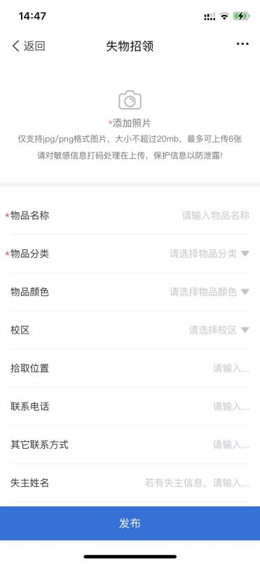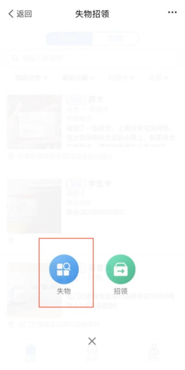 (2)如果丢失物品,可以点击【发布】选择【失物】,然后填写相关信息并发布。