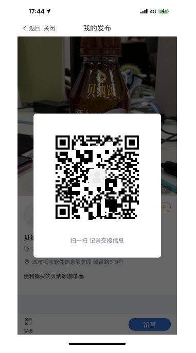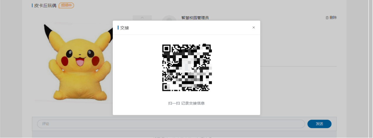 按钮或进入帖子详情页点击交接按钮,弹出二维码。
