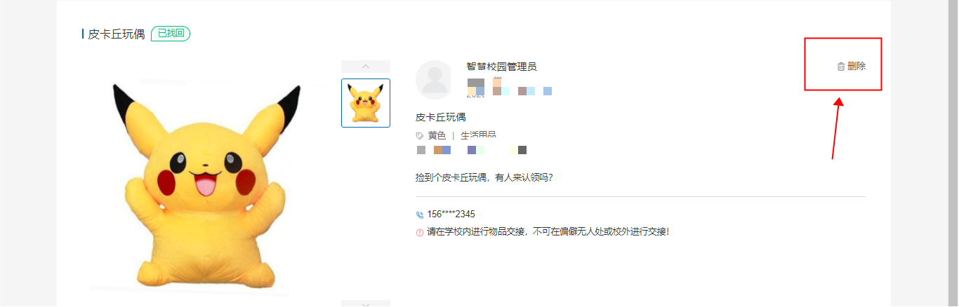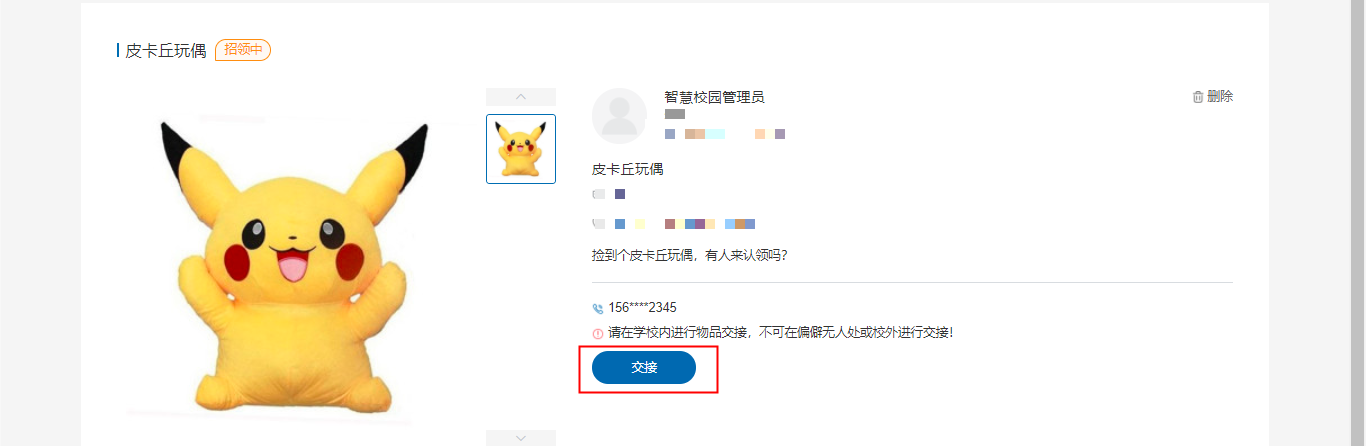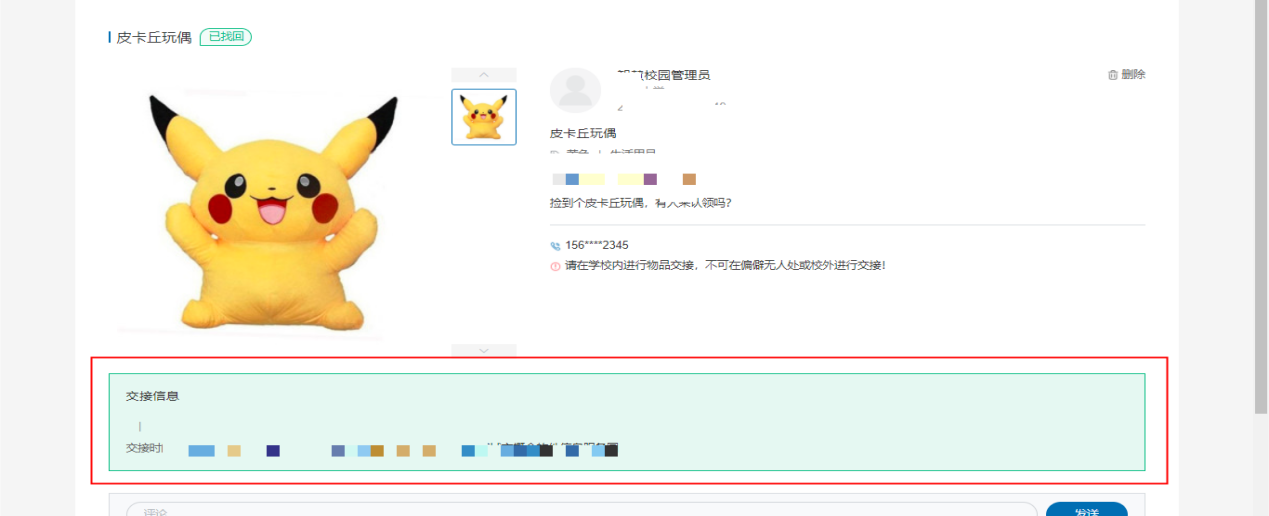 (4)交接功能。可以将捡到或认领物品的交接人的信息记录下来,交接完成之后将会显示【已认领】状态。