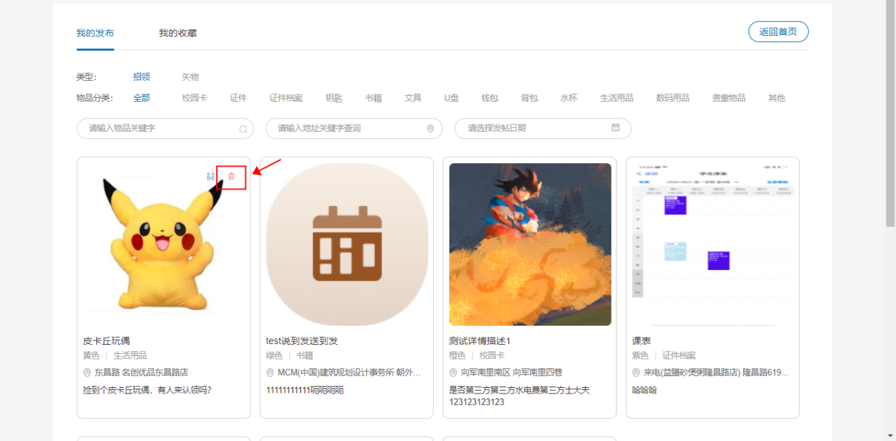 (3)可以在【我的发布】里查看自己发布的所有帖子,鼠标悬浮帖子上会出现删除按钮或进入帖子详情页点击删除按钮,可选择是否删除。