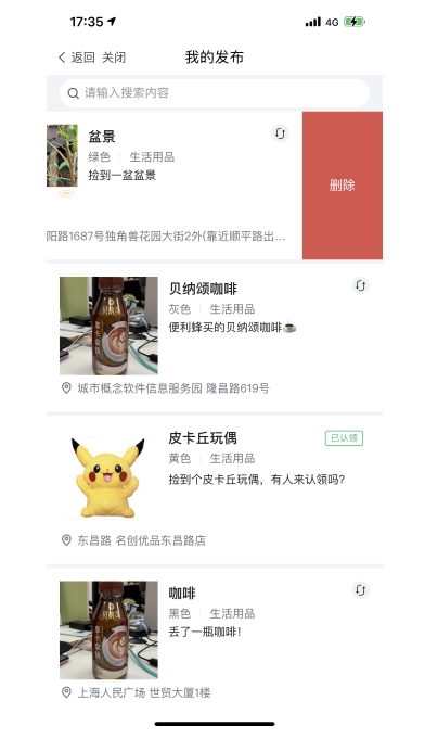 (3)可以在【我的发布】里查看自己发布的所有帖子,手势左滑会出现删除按钮,可选择是否删除。