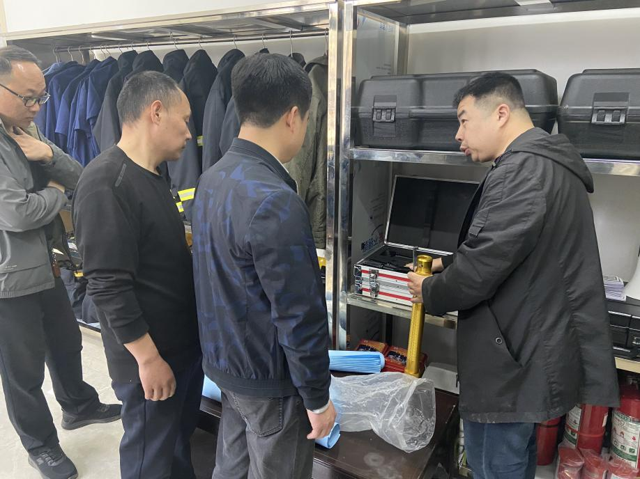 演练结束后,刘涛科长带领中心人员参观了东校区微型消防站的消防器材区、视频调度区和值班办公区,详细介绍了站点救援辐射范围、消防应急设备使用、微型消防站火灾处置流程等内容,并演示了破拆器、防护服、防毒面具等消防器材使用方法。