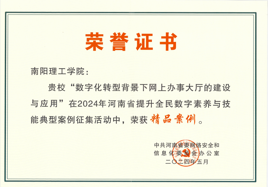 本网讯(特约记者/古宸豪)5月27日,2024年全民数字素养与技能提升月河南省活动开幕式在信阳举行。开幕式上,发布了河南省提升全民数字素养与技能典型案例名单。经河南省委网信办、省委党校、省教育厅等15部门联合评审,共评选出10个精品案例、20个优秀案例。其中,南阳理工学院提交的案例《数字化转型背景下网上办事大厅的建设与应用》荣获2024年河南省提升全民数字素养与技能精品案例(数字工作类)。