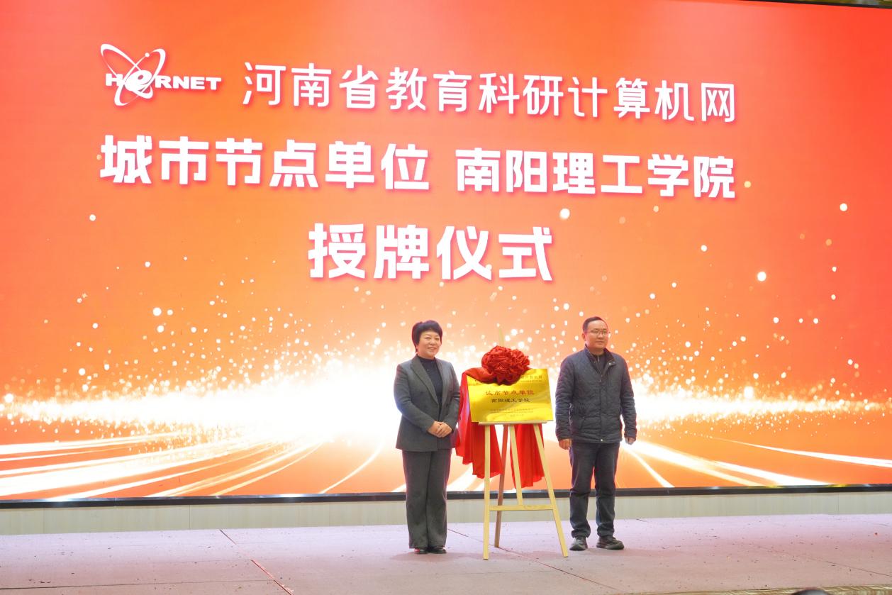 在授牌仪式环节,高芳放、彭亚宁两位领导共同为“河南省教育科研计算机网城市节点单位”揭牌,标志着我校正式成为全省教育科研网网络体系中的重要枢纽单位