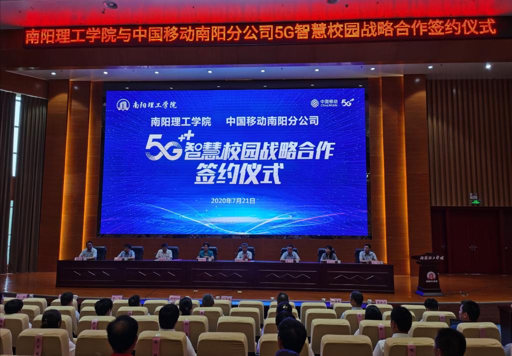 本网讯(特约记者 黄照鹤)7月21日,我校与中国移动南阳分公司5G+智慧校园战略合作签约仪式在第三报告厅举行。中国移动南阳分公司党委书记、总经理魏际洲,副总经理曹飞、尹小栩、王靓等,校领导刘荣英、肖泽昌、葛晨光等出席签约仪式。会议由校长安士伟主持。