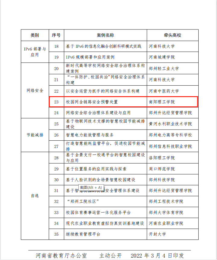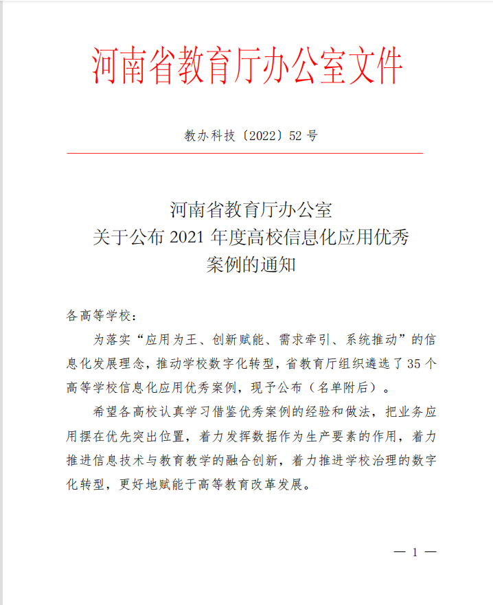 近日,经全省各高校自主申报和专家统一评审,河南省教育厅发布《关于2021年度高等学校信息化应用优秀案例的通知》,公布2021年度高等学校信息化应用优秀案例35个,我校《校园网全链路安全预警处置》项目入选。