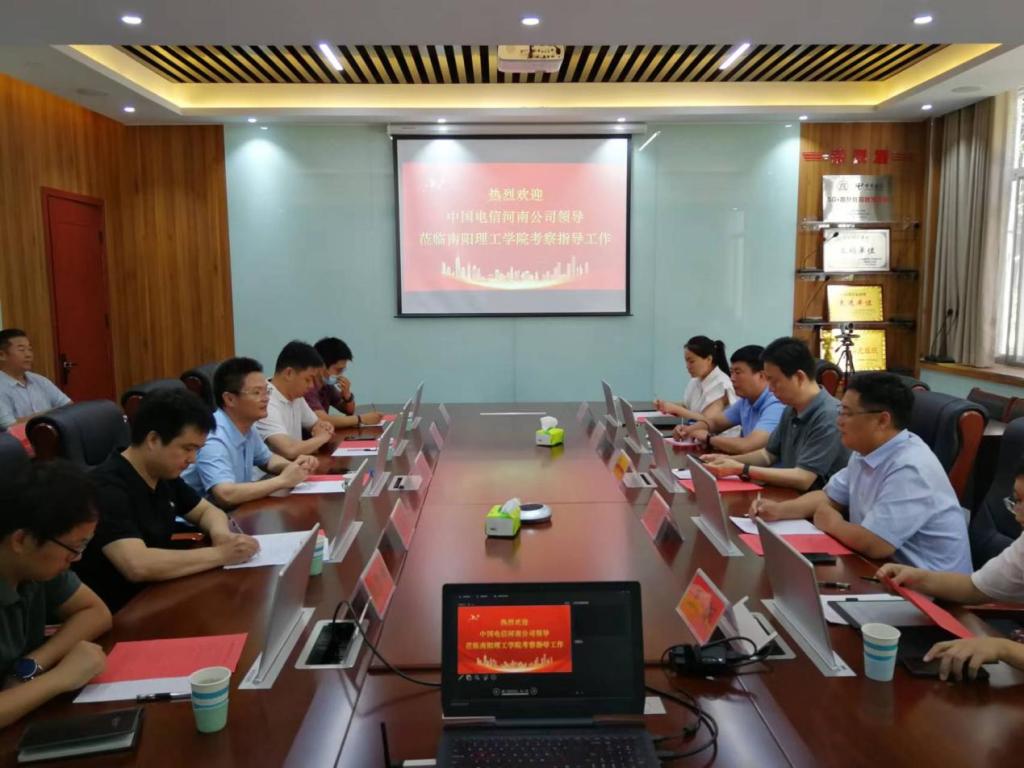 本网讯(特约记者/吴绍兴)2022年7月21日,中国电信河南公司教育客户部总经理张旻、南阳电信公司总经理石辉等一行9人来我校交流智慧校园建设。副校长、首席信息官郝好山主持会议,信息化建设与管理中心负责人参加会议。