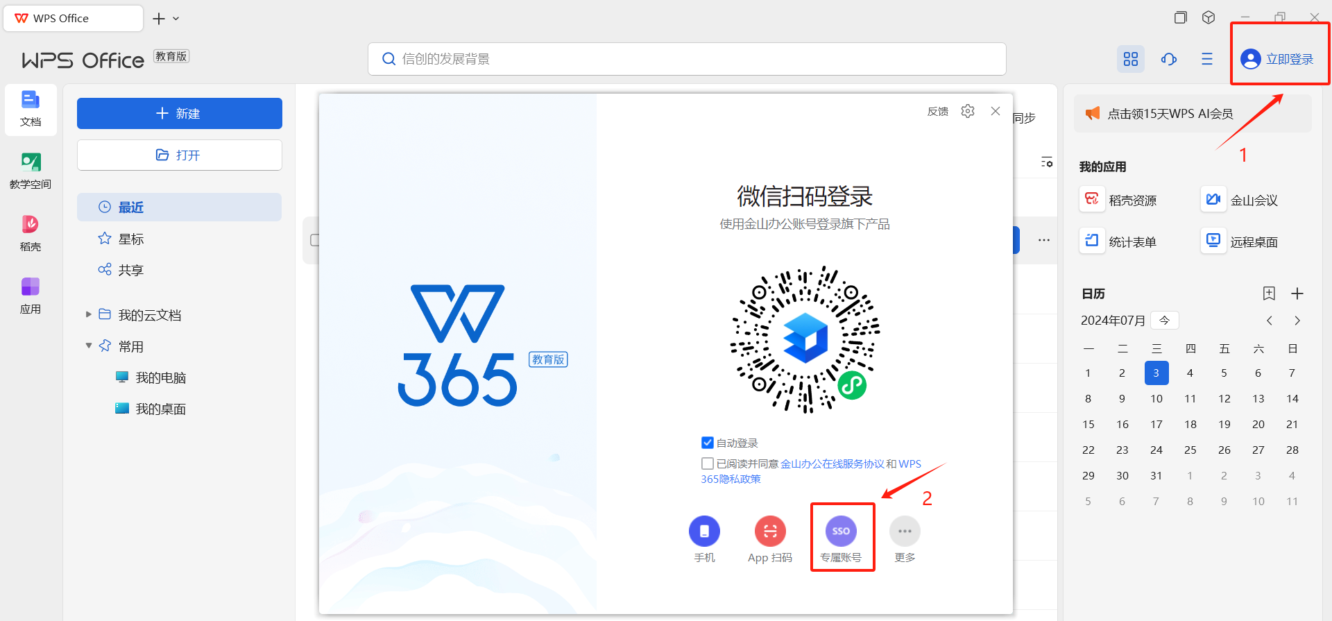 (1)打开WPS 365客户端点击右上角“立即登录”,登录方式选择“专属账号”,如未出现“专属账号”登录方式,点击其他登录方式选择“第三方企业码”。